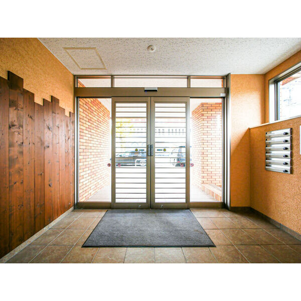 ベージュとレンガ調のタイルが組み合わさった外観は、住宅街の中でも落ち着いた存在感を放っています。エントランスにはオートロックとカメラ付きインターホンが備わり、家族が安心して出入りできる環境が整っています。エレベーターが1基あるため、小さな子どもと一緒の買い物帰りも、荷物が多い日も、日々の出入りが負担になりません。屋根付きの駐輪場も設けられており、自転車を使う家族にとって雪の日も心強い設備です。